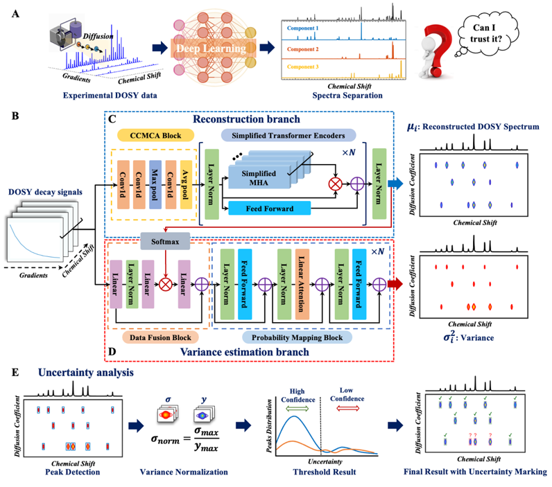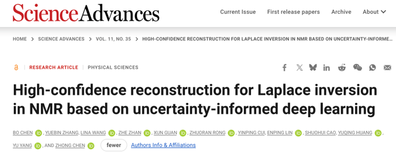 近日,电子科学与技术学院陈忠教授团队在基于深度学习的拉普拉斯核磁共振(NMR)谱图重建与不确定度量化方面取得重要突破,相关成果以High-Confidence Reconstruction for Laplace Inversion in NMR Based on Uncertainty-Informed Deep Learning为题,发表在Science Advances期刊上。这一成果首次将不确定度估计引入拉普拉斯NMR重建过程,能够在保证高质量谱图解析的同时,实现量化结果的可靠性