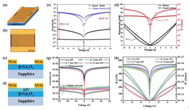 图3 (a-d) MSM结构氧化镓日盲深紫外光电探测器:(a)器件结构示意图,(b)光学显微镜照片,(c) I-V特性曲线,(d)光响应度、比探测率曲线;(e-h) 具有氮化铝层的MISIM结构氧化镓日盲深紫外光电探测器:(e-f)有/无氮化铝层的器件结构示意图,(g)有/无氮化铝层的I-V特性曲线,(h)光响应度、比探测率曲线。