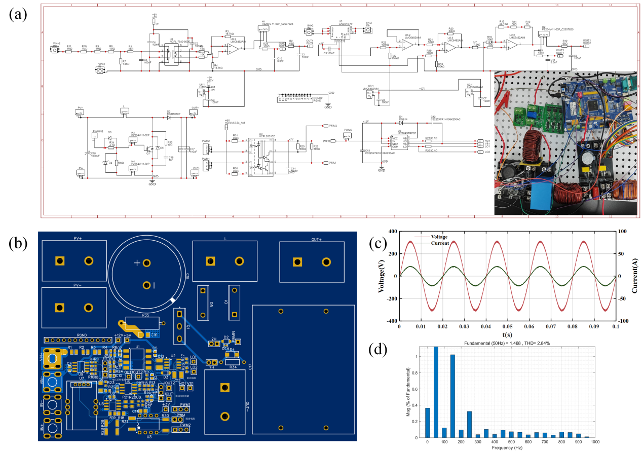 图2 (a)光伏逆变器系统部分原理图及实物图;(b)原理图对应版图;(c)逆变器输出电压电流曲线;(d)逆变器输出电流THD分析。