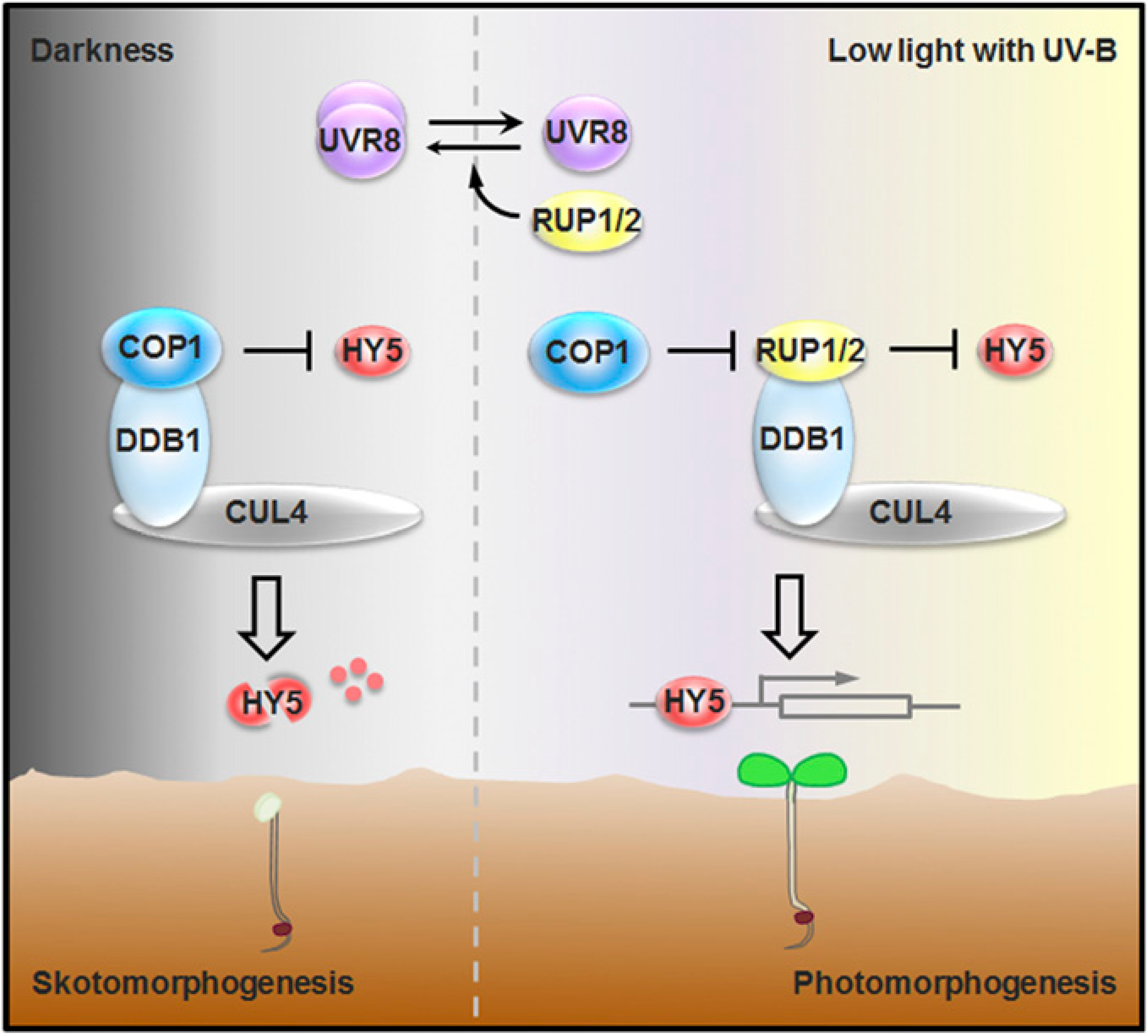 有意思的是,COP1在UV-B光下帮助HY5蛋白的稳定,促进光形态建成。而在其他光照条件下则介导HY5蛋白的降解,抑制光形态建成。作为光形态建成的关键调控因子,COP1如何行使截然相反的功能是光信号领域悬而未决的问题。研究人员发现COP1能与RUP1/RUP2蛋白发生直接的相互作用,并利用多种实验手段阐明了它们的相互作用一方面隔离了HY5和COP1,另一方面使RUP1/RUP2被COP1泛素化而降解,进而促使HY5蛋白稳定积累,光形态建成得以顺利进行。