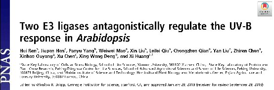 2019年2月20日,细胞应激生物学国家重点实验室、厦门大学生命科学学院黄烯教授课题组在PNAS在线发表了题为Two E3 Ligases Antagonistically Regulate the UV-B Response in Arabidopsis的研究论文,揭示了拟南芥中两类泛素连接酶形成“抑制”与“去抑制”机器,拮抗调控UV-B光形态建成的分子机制。