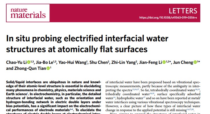 我校化学化工学院李剑锋、程俊教授课题组在固液界面上研究水分子的构型方面取得重大突破。相关研究成果“In situ probing electrified interfacial water structures at atomically flat surfaces”在线发表于Nature子刊《自然-材料》(Nature Materials, DOI:10.1038/s41563-019-0356-x)。