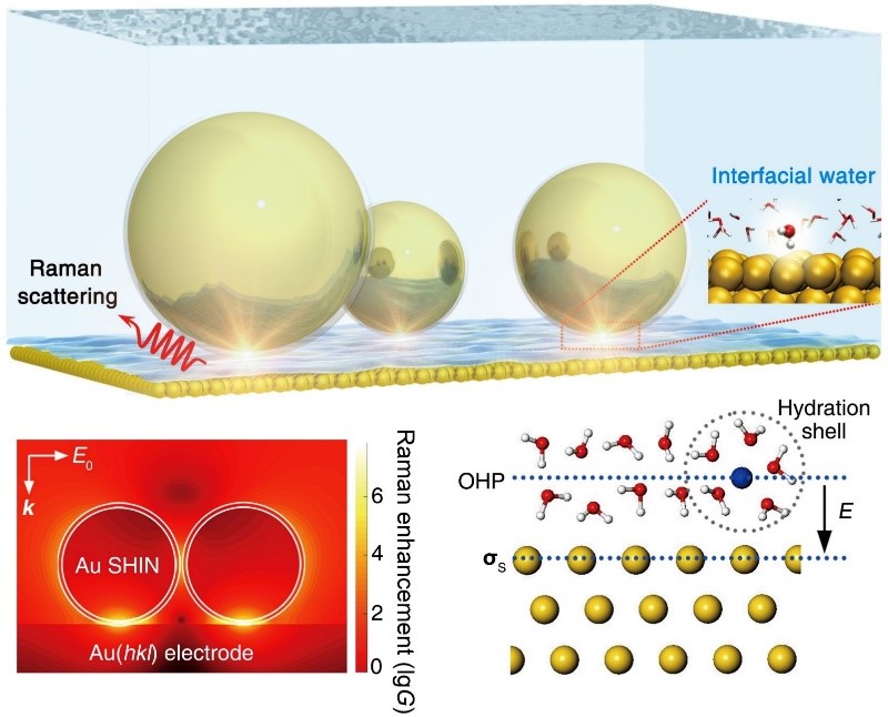 自然界中水无处不在,人们对水分子的研究已经长达一个多世纪。特别是在材料表面,从原子结构层面理解界面水所发生的各种物理和化学过程,将有利于指导能源和环境领域中开发更好的技术和器件。特别是在电化学中,界面水的详细结构,比如其在双电层中的取向以及复杂的氢键网络,对电极材料的电化学性能具有显著影响。文献中采用振动光谱已经推知了水在金属界面的不同构型,如四配位水、三配位水、表面特性吸附水、自由水等。然而,仍然缺乏这些界面水在不同电位下清晰的构型图像。在原子级平整的单晶表面进行光谱检测,将有助于揭示界面反应的机理和构型相关的活性,对电化学能源界面的研究具有重要意义。李剑锋教授课题组采用不受体相水干扰的表面增强拉曼光谱,首次在金(111)和(100)单晶电极表面上获得了界面水的拉曼信号,并且在析氢反应过程中原位观测到了界面水的两种构型转变。发现界面水随着电位的负移,由“平行”结构向“单端氢朝下”,再向“双端氢朝下”变化。程俊教授课题组采用从头算分子动力学理论方法,模拟出不同电位下,在双电层中界面水的三种构型以及相应的氢键数目,与实验数据很好地吻合,进一步揭示了双电层的原子级结构。该研究首次在实验和理论层面,将界面水的构型转变以及氢键断裂与精确的电极电势标尺进行关联,对探知双电层的三维结构具有指导性意义。