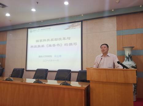 2018年11月8日,应校科技处的邀请,原湖南大学科研院综合办主任、科技奖励与成果评价办公室主任、现北京工业大学科学技术发展院特别顾问、中国高等教育学会科技管理研究分会常务理事及副秘书长周克刚研究员在我校颂恩楼220报告厅为学校师生作了题为《我国科技奖励改革与科技报奖< 推荐书>要点的撰写》的专题报告。我校理工医科各学院院长、科研副院长、科研秘书、拟申报科技奖励的相关教师参加了会议。为方便广大师生观看,科技处在翔安校区设立了网络直播分会场。会议由科技处处长谭忠主持。