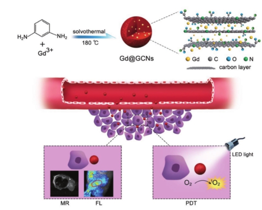 传统的光敏剂多数是疏水小分子,其水分散性差,光稳定性低,肿瘤区域的富集不够。虽然目前大部分研究将光敏剂和成像剂一起负载到纳米载体上,但这些成像剂或光敏剂易脱落,并且很多纳米载体具有潜在的毒性且难以快速清除,此外,纳米载体或成像试剂也会干扰光动力治疗过程,降低ROS产量。针对这一基本问题,团队在前期工作基础上(Adv. Mater. 2014, 26, 6761; Adv. Funct. Mater. 2016, 26, 3973,封面文章; Theranostics 2013,3, 650),利用溶剂热法量化制备具有红光发射的内嵌钆碳点。与传统的碳点相比,该碳点展现出高结晶度,强烈的红色荧光,高效的钆掺杂率和表面一定的还原特性;与Gd-DTPA相比,由于碳层的包裹,钆碳点表现出极高的纵向弛豫效率(r1=16mM-1 S-1, 7T);更重要的是该钆碳点在LED灯辐射下能够有效的产生单线态氧(量子产率达到0.51)。此外,该碳点具有较小的尺寸(约5纳米),可以通过EPR效应积累在肿瘤部位,并且,钆碳点能够通过肾脏代谢掉,因而具有较低的毒性。活体实验证明此钆碳点成为集荧光成像、磁共振成像和光动力治疗于一体的纳米诊疗探针。这一研究工作为深入探索“钆稳定”纳米探针与金属掺杂增强光化学作用的机制以及设计具有高ROS产率和优异稳定性诊疗一体化纳米探针提供了新的研究思路。
