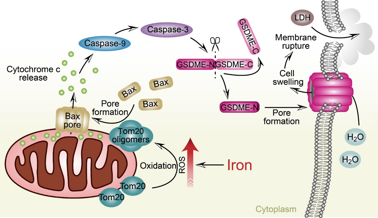 在研究铁代谢过程中,吴乔课题组意外发现在黑色素瘤细胞中铁参与细胞焦亡的诱导过程。CCCP是线粒体损伤剂。当内源性铁蛋白被破坏时,胞内游离铁增加,CCCP通过焦亡方式特异性诱导黑色素瘤细胞死亡。机制分析表明,铁离子和CCCP(或者其他ROS诱导药物)共同处理黑色素瘤细胞引起细胞ROS水平显著升高,线粒体外膜蛋白Tom20能够感知ROS,并被ROS氧化形成多聚体,由此促进线粒体聚集以及募集Bax蛋白到线粒体表面形成孔道,进而促进细胞色素C释放到胞浆,激活Caspase-9/Caspase-3;活化的Caspase-3切割并激活GSDME,导致细胞发生焦亡并释放LDH。机制研究展示了一条信号转导的新通路:ROS-Tom20-Caspase 3-GSDME。在小鼠模型中我们进一步验证了铁和ROS诱导药物联合使用可以通过激活GSDME来抑制黑色素瘤生长与转移。重要的是,这种抑制效果对小鼠的毒性极小。缺铁患者(2毫克铁/千克体重/天)使用的铁剂量补充就足以使这些临床药物的抗肿瘤作用最大化。黑色素瘤细胞表达较高水平的GSDME。由于黑色素瘤细胞通常对凋亡有抵抗力,这种与铁相关的焦亡诱导可能代表另一种治疗黑色素瘤的策略,对于黑色素瘤治疗及药物研发具有非常重要的意义。