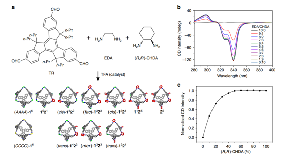 曹晓宇课题组以先前发展的笼状分子为基础(Nat. Commun. 2016, 7, 12469; JACS 2017, 139, 18142; Chem. Comm. 2017, 53, 8956),构建了一类全新的兼具手性和非手性顶点的手性笼状分子,为研究超分子组装中的手性传递提供了理想的平台。传统超分子组装体利用非共价相互作用,如氢键、π-π相互作用、配位键等,将组装基元组装成为组装体;但非共价作用组装体系的稳定性较差,无法耐受常用的分离和分析手段,因而阻碍了进一步的动力学研究和深层次的机理研究。该项工作中所采用的组装体基于亚胺键这一动态共价键,不仅保留了超分子组装可逆性,更大幅提高了最终组装体的稳定性;因而可以以独立地研究每一种包含不同数目手性顶点的笼状分子的特点,跟踪它们各自的结构特征、浓度变化行为,进而推测超分子体系中手性放大效应的根源。结构分析表明,在分立组装体中仅需一个手性基元即可决定整个组装体的手性特征;物化数学模型表明,整个混合体系的手性非线性放大来源于不同构型笼状分子的不平衡分布。物化数学模型可以很好的拟合实验数据,进而解释了分立组装体系中手性非线性放大与各组装体结构能量的关系。