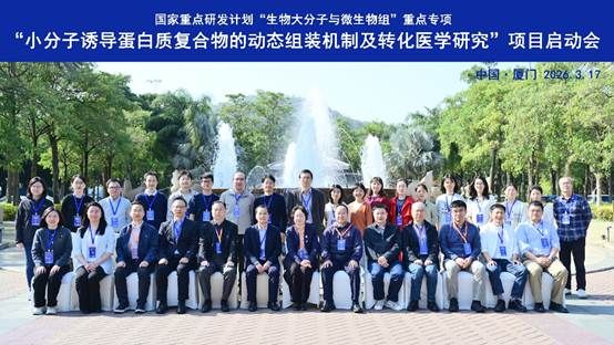 3月17日,国家重点研发计划“生物大分子与微生物组”专项——“小分子诱导蛋白质复合物的动态组装机制及转化医学研究”项目启动会在厦门召开。本项目由厦门大学牵头,联合北京生命科学研究所、武汉大学、上海科技大学、中国科学院分子细胞科学卓越创新中心共同承担。会议旨在贯彻落实国家重点研发计划面向科学前沿和国家重大需求的战略部署,推动多学科交叉融合与协同创新,系统部署小分子诱导蛋白质复合物动态组装机制与转化医学研究。